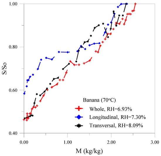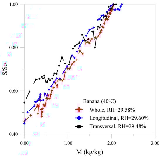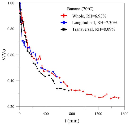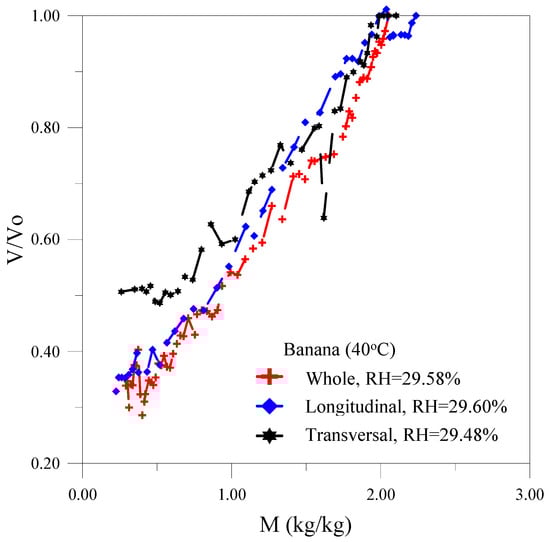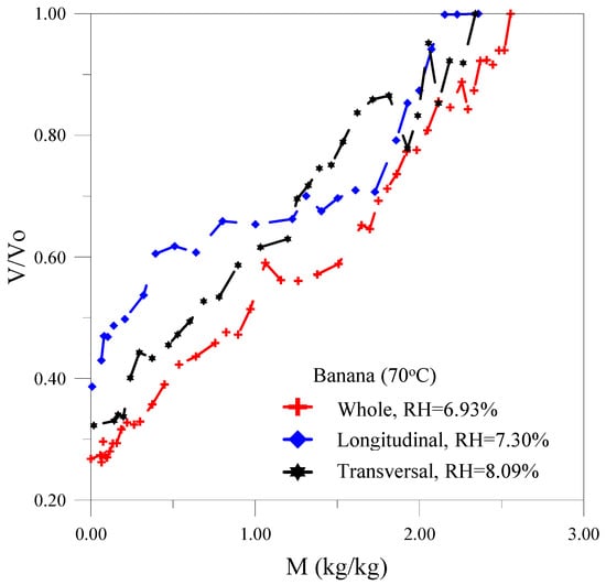 Figure 9 and Figure 10 illustrate the dimensional variations in the banana in the various geometric shapes for each value of the average moisture content along the process, for temperatures of 40 and 70 °C. Note that for all cases, at the earlier stage of the process, there is a large quantity of moisture removal, particularly for bananas cut transversally. Therefore, the dimensions of the banana change from a high shrinkage rate to zero. However, by comparing the graphs, it can be seen that, for the drying temperature of 40 °C, the banana’s volume variation occurs more uniformly since the water’s removal is slower, causing slower heating and drying. For drying at a temperature of 70 °C, there is a huge loss of water at the earlier stage of the process, causing a high reduction in the volume of banana samples. In addition, there is a linear dependence between the volume and the moisture content, indicating that the amount of water removed is equivalent to a reduction in the volume of the fruit, and that the geometric shape of the banana has a huge impact on the reduction in volume in the drying process; for bananas cut transversally, the effect of volume reduction is much less pronounced.