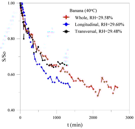 Regarding the processing time, it is observed that, for the whole banana, drying times increased around 20.3 h with a 30 °C reduction in temperature. Thus, the drying time at 40 °C is 84% longer than at 70 °C. For bananas sliced longitudinally, the drying time increased around 12.3 h with a 30 °C reduction in temperature. Then, the drying time at 40 °C is 117% longer than at 70 °C. For banana sliced transversally, the drying time increased around 8.7 h with a 30 °C reduction in temperature. Thus, the drying time at 40 °C is 70% longer than at 70 °C. These results show the importance of the study related to the shape of the fruit during drying.