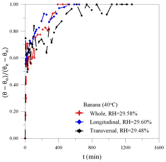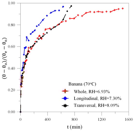 The dimensionless temperature of the sample () at each moment of drying is a function of the surface temperature of the banana (), the initial temperature () and the equilibrium temperature (), as indicated in Equation (5).