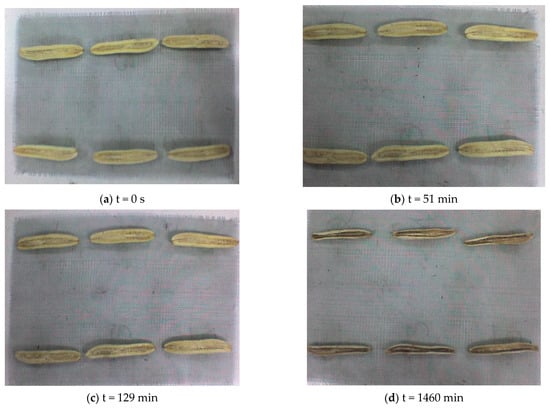 Figure 17 illustrates the transient behavior of the banana sliced lengthwise during drying at 40 °C. Upon examining Figure 17, it can be clearly observed that the banana has different effects during the drying process, such as darkening and severe deformations, caused by water and thermal stresses mainly in the transverse direction. The hardening of the banana surface was visually verified during and after the experiments.