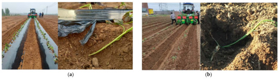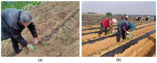 Sweet potato slips are planted manually in the raised beds (RB) and raised beds mulched with plastic film (RBF) cultivation systems in northern China. (a) RB cultivation system; (b) RBF cultivation system.