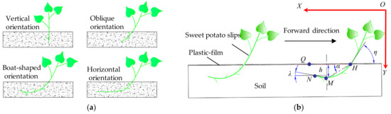 Depending on their experience and location, farmers use various tillage methods and planting postures for sweet potato cultivation [25]. The tillage systems, which include RBF and RB, optimize infiltration and facilitate root expansion [26]. In northern China, slip placement at planting varies from vertical orientation, oblique orientation, and boat-shaped orientation to horizontal orientation (as shown in Figure 2a), to realize more nodes buried in shallow soil layers [27]. At present, the boat-shaped placement is widely used in the RBF and RB cultivation systems, since it has the advantages of labor-saving compared with horizontal placement, producing more sweet potato tubers of uniform size compared with oblique placement. Therefore, the 2CGFS-2 compound sweet potato transplanter was designed based on the agronomic requirements of boat -shaped placement in both RBF and RB cultivation systems [28].