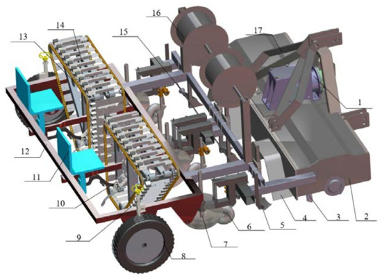 Structure of the 2CGFS-2 compound transplanter for sweet potato slip cultivation in the RBF and RB cultivation systems in northern China. Note: 1, Transmission box; 2, Lateral sealing plate; 3, Rotary component; 4, Ridging board; 5, Ridging opener; 6, Film pressing wheel; 7, Soil covering disc; 8, Driving wheel; 9, Height adjustment; 10, slip taking-planting mechanism; 11, Chair; 12, Frame; 13, Drive system; 14, Slip delivery mechanism; 15, Plastic-film frame; 16, Laying device of drip irrigation belt; 17, Three-point hitch system.