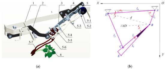 The structure and parameter design of the slip taking-planting mechanism. (a) Mechanical structure of the mechanism. (b) Schematic model of the mechanism. Note: 1, Frame; 2, Rocker; 3, Connecting rod; 4, Crank; 5, Seedling clamping assembly; 5-1, Driving cam; 5-2, Roller; 5-3, Bracket; 5-4, Guide rail; 5-5, Spring; 5-6, Clip finger I; 5-7, Clip finger II; 6, Sweet potato slips. A, B, C, D, E, hinge points of each bar; l1, length of the crank; l2, length of the connecting rod; l3, length of the rocker; l4, length of the frame; l5, length of the working rod; xA, horizontal ordinate of the hinge point A; yA, longitudinal coordinate of the hinge point A; θ, angle between the working rod and the connecting rod; φ0, angle of the rack; φ, rotating angle of the crank.