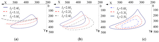 Assuming that the crank length l1 is fixed, we analyzed the relationship between the planting trajectory and other parameters for different decision variables. As shown in Figure 5, the variation of l2 affected the overall shape of the planting trajectory, which directly determined the planting placement pattern. Additionally, the change in l4 had an effect on the area enclosed by the planting trajectory, which was related to the disturbance extent of the soil or mulched film and the slip length buried in the RBF or RB soil. On the other hand, φ0 was proportional to the soil penetration angle η, while l3, l5, and θ also had a slight impact on the planting trajectory.