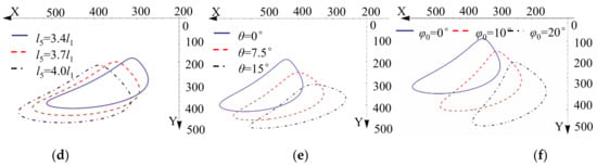 Influence of parameters on the trajectory E(x, y). (a) Relationship between l2 and the trajectory; (b) relationship between l3 and the trajectory; (c) relationship between l4 and the trajectory; (d) relationship between l5 and the trajectory; (e) relationship between θ and the trajectory; (f) relationship between φ0 and the trajectory.