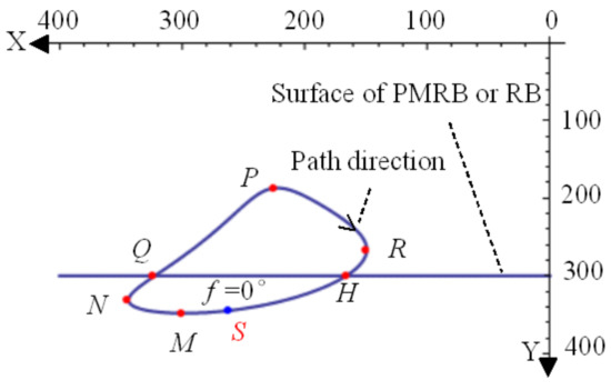 According to Equations (2), (12) and (13), the coordinates and polar coordinate parameters of the farthest planting point N and the nearest planting point R would be calculated when x′ = 0, while the coordinate parameters of the uppermost point P and the deepest point M would be obtained when y′ = 0. Besides that, the coordinate parameters of penetrating point H and unearthed point Q would also be determined when y = yM − h.