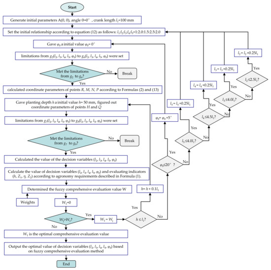 In order to determine the optimal parameter combination, we first set the initial value and solution interval of the decision variables according to Formula (12). Then, the constrains from g2(l2, l3, l4, l5, φ0) to g6(l2, l3, l4, l5, φ0) (Equations (2) and (11)) and g7(l2, l3, l4, l5, φ0) to g9(l2, l3, l4, l5, φ0) (Equations (14) and (16))were further given. Subsequently, dozens of decision variable value groups and their relative evaluation indexes of transplanting performances, i.e., planting depth h, length of slips under the soil Z1, planting angle η and disturbance length Z2 (as shown in Formula (1)), were obtained through the solution process as shown in Figure 7. Finally, fuzzy comprehensive evaluation method [31] was used to optimize these parameters. With consideration for slip planting practices, we set the weight distribution of the planting indexes as