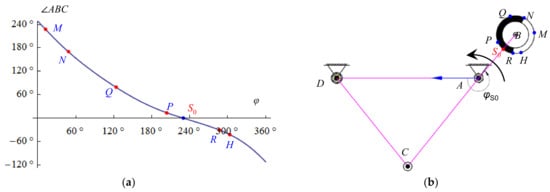 The organization of the working sequence between the crank rocker assembly and seedling clamping assembly. (a) Relationship between ∠ABC and the independent variable φ. (b) Initial work status. Note: A, B, C, D, hinge points of each bar consistent with the symbols in Figure 4; P, the uppermost point of the planting track; M, the deepest point of the planting track; N, the farthest point of the planting track; R, the nearest point of the planting track; H, the penetrating point; Q, the unearthed point; S0, the initial position; φS0, the angle value of the independent variable φ at the initial position.