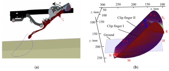 The kinematics simulation analysis of the slip taking-planting mechanism. (a) Simulation model. (b) Trajectory of the clip finger in the slip taking-planting mechanism. Note: P, the uppermost point of the planting track; M, the deepest point of the planting track; N, the farthest point of the planting track; R, the nearest point of the planting track; H, the penetrating point; Q, the unearthed point; S0, the initial position; d, the distance between the trajectories of clip finger I and II.