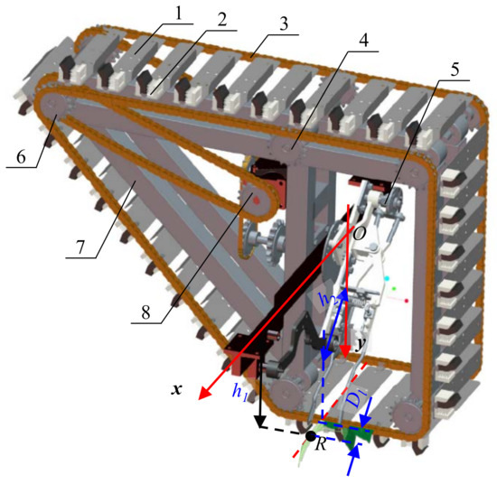 As shown in Figure 10, the slip delivery mechanism was composed of a slip placement board, slip clamping brush, double-chain, transmission, etc. Orderly cooperation between the slip taking-planting mechanism and the slip delivery mechanism was essential for the continuous supply and transplanting of sweet potato slips. There were two key conditions to realize reliable and orderly cooperation: (1) the sweet potato slips, which were attached in the slip delivery mechanism, should pass through point R to be taken by the clip fingers; (2) when the slip taking-planting mechanism moved a circle, the slip delivery mechanism should simply supply one slip at point R. To realize the first condition, the following equation was formulated: