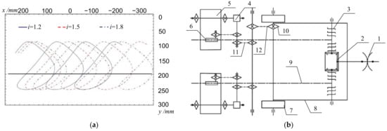 Transmission design of the slip transplanting apparatus. (a) The planting trajectory of the slip transplanting apparatus during operation. (b) Transmission path. Note: 1, Cardon joint; 2, Gearbox; 3, Rotary blade group; 4, Commutator; 5, Slip delivery mechanism; 6, Slip taking-planting mechanism; 7, Ground wheel; 8, Frame; 9, Middle line of the ridge; 10, Sprocket; 11, Chain drive; 12, Adjustable primary chain drive.