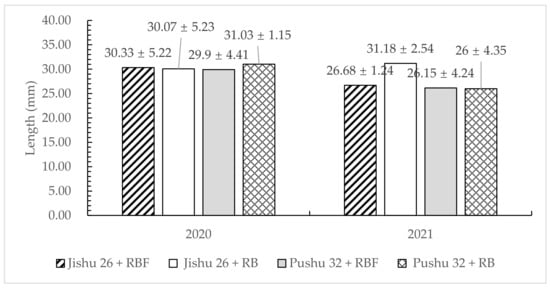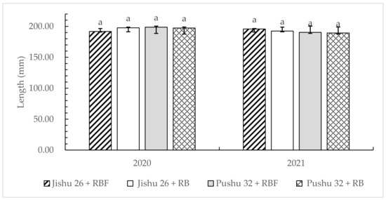 Among the RBF treatments, mean fresh tuber yields for Jishu 26 and Pushu 32 were 27.1% and 22.5%, respectively, significantly (p < 0.05) higher than those in RB treatments. The data indicated more tuber growth of the sweet potatoes under the RBF treatments, since RBF was proven to be effective in improving soil water moisture and soil temperature [11,12,13]. Similar results was also shown in the researches by Hou et al. [13] and Li et al. [36]. Chagonda et al. also concluded that soil moisture and temperature influence the sub-aerial soil microclimate around the sweet potato plant, which has an effect on storage root initiation, growth and development [26].