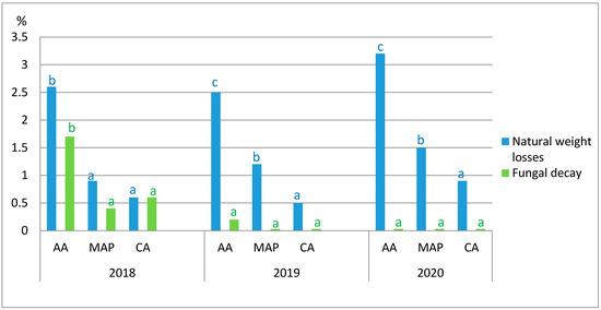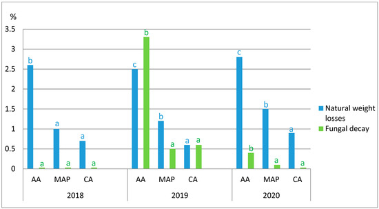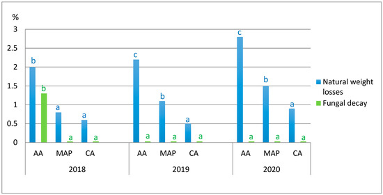 Natural weight losses (%) and fungal decay (%) of ‘Albion’ strawberries as affected by storage conditions. Bars characterizing fungal decay should be green (like the letters) blue letters and bars refer to weight mass losses.
