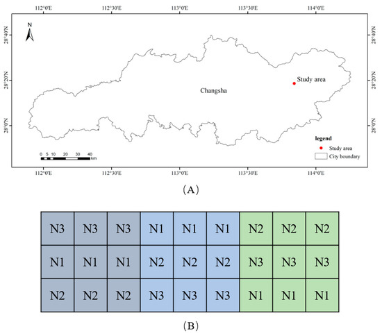 Overview of the study area. (A) geographical location of the study area and (B) fertilizer conditions in each plot. N1, N2 and N3 represent the different tillering fertilizer treatment (N1: 300 kg/hm2 15-15-15 compound fertilizer and 225 kg/hm2 urea; N2: 150 kg/hm2 15-15-15 compound fertilizer and 150 kg/hm2 urea; N3: 75 kg/hm2 urea).