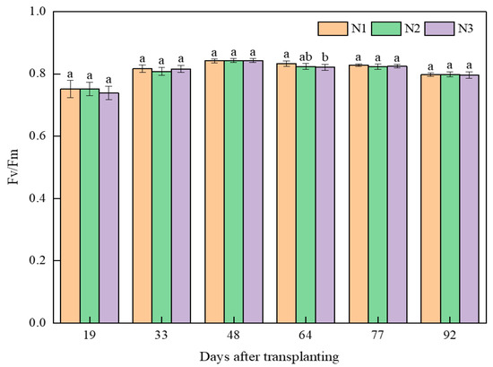 Trends of Fv/Fm with fertility under different fertilizer conditions. Different letter means the significance level.