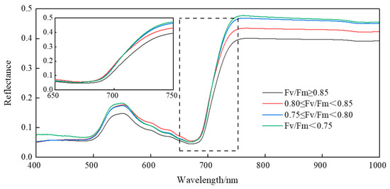 The Fv/Fm values of the leaf samples were divided into four intervals according to a step size of 0.05 [51], and the reflection spectra of rice leaves corresponding to Fv/Fm values in each interval were averaged, as shown in Figure 4. The spectral reflectance of rice leaves conforms to the general rule of the plant spectrum, and it is affected by the content of pigment and nitrogen in leaves and the internal structure of leaves (leaf gap and cell thickness). The spectrum of rice leaves forms two absorption valleys (“blue valley” and “red valley”) and one reflection peak (“green peak”) in the visible band. The phenomenon of “red edge” with a sharp rise of reflectivity appears between visible and near-infrared bands. A high reflectivity platform “red shoulder” appears in the near-infrared band. The spectral reflectance of rice leaves in different intervals of Fv/Fm showed roughly the same change law, but there were also obvious differences, namely, with the increase in leaf Fv/Fm, the overall spectral reflectance showed a downward trend. The decrease in spectral reflectance in the 500–700 nm region reflected this trend very obviously. In the red-edged area, with the decrease in Fv/Fm, the slope of spectral reflectance increases obviously.