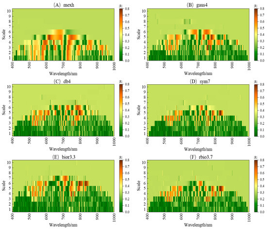 where λ is the number of spectral bands; a is the scale factor; b is the translation factor; is the spectral reflectance of leaves; is the wavelet basis function; and is the wavelet coefficient. Since the dimensionality reduction effect of different wavelet basis functions is different, according to previous studies [22,23,24,50], different mother wavelet functions were applied in this study to process hyperspectral data. Finally, we selected six mother wavelet functions, mexh, guas4, db4, sym7, bior3.3, and rbio3.7, as the basis functions of the process of CWT, and the decomposition scales were set as 21, 22, …, 210, corresponding to scales 1–10.