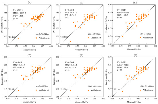 1:1 relationship between predicted and measured values of Fv/Fm based on different mother wavelet functions. (A) mexh, (B) gasu4, (C) db4, (D) sym7, (E) bior3.3, (F) rbio3.7.