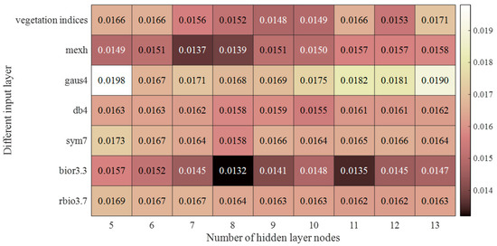 According to the results of CWT in Figure 5, 10 vegetation indices and the 10 bands with the highest |R| under each mother wavelet function (Table 6) were selected as sensitive bands, and the wavelet coefficients corresponding to them were used as the input layer of the BP neural network, The Fv/Fm of rice leaves was used as the output layer to construct BP neural network models individually, and the results are shown in Figure 7 and Table 7. As shown in Figure 7, the number of different hidden layers had a significant influence on the accuracy of the model and every neural network had an optimal number of hidden layer nodes. The fitting effect and prediction accuracy of the model constructed by the BPNN were improved compared with those of the univariate model, which was due to the stronger nonlinear fitting ability of machine learning.