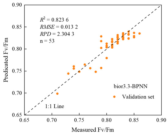 As a spectral data processing method, CWT can well mine weak and effective spectral information, which is of great significance in the inversion of crop growth parameters [57] and has also been used to monitor the kinetic parameters of chlorophyll fluorescence. Zhao et al. [23] combined the CWT and RF algorithms, and the monitoring modeling of potato leaf Fv/Fm values showed that bior3.3-RF-PLS had the best monitoring performance. Jia et al. [24] investigated wheat leaves and discovered that linear models built from wavelet-based REP (WREP-S4) and wavelet features (704 nm, scale 4) outperformed other spectral features in calibration and validation datasets. In the study of Fv/Fm estimation using CWT, the choice of a mother wavelet function and the most appropriate decomposition scale are not sufficient. There are also great differences in the ability of different types of mother wavelet functions to describe local features of spectral signals. Therefore, six kinds of mother wavelet functions were selected as the basis functions of CWT. The results showed that the bands with a high correlation between wavelet coefficients and Fv/Fm were mostly in the range of 700~850 nm after using different mother wavelet functions for wavelet transform, and the decomposition scales were all in the optimal scale of scale 3 to scale 6 (Figure 5). The accuracy of the Fv/Fm estimation model constructed by using the obtained wavelet coefficients was significantly improved compared with the model constructed by the vegetation index. The RPDs of the univariate Fv/Fm estimation model based on the optimal wavelet coefficients and the BPNN model based on the first 10 sensitive wavelet coefficients both reach the level of rough evaluation of the model. Meanwhile, the RPD of the BPNN model was higher than that of the univariate model, which indicated that the monitoring performance of the Fv/Fm estimation model could be optimized through the machine learning algorithm. However, only the mexh-BPNN (10-7-1), db4-BPNN (10-10-1), and bior3.3-BPNN (10-8-1) models had high reliability and could be used for model analysis, among which the bior3.3-BPNN (10-8-1) model had the best monitoring performance.