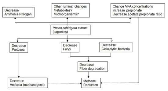 Proposed modes of action for ruminal methane reduction with Yucca schidigera extracts.