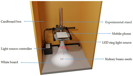 The image acquisition system is presented in Figure 1, which includes a mobile phone, a ring-light source with an adjustable light intensity, and seeds. The phone used was a Xiaomi MIX2. To mimic the light conditions on the assembly line, an LED ring-light source was placed at the center of the set-up. This way, the seeds could be imaged clearly. Additionally, it was ensured that the light intensity was constant via the use of a light-source controller. A cardboard box was placed around the equipment to prevent the interference of natural light. The whiteboard placed underneath the seeds was used to mimic the quality of the conveyor-belt device presenting a monotonous color. The phone was placed at a distance of about 10.5 cm from the whiteboard. Subsequently, 1292 images were captured, and the ratio of the training set to validation and test sets was 8:1:1. The environment was kept consistent while shooting was performed. The photographed seeds were not in contact with each other, as can be observed in Figure 2. In the dataset, each seed was captured once or twice. The dataset included images of one type of seed as shown in Figure 2a–j as well as the combinations of multiple types of seeds as shown in Figure 2k–m. The dataset had a resolution of 600 × 800 pixels and was saved in a “JPG” format. When the dataset was fed into the network, all the images were scaled to 416 × 416 pixels, which reduced the training time and memory usage. After the long side was scaled to 416 pixels, the short side was also scaled to the same multiple. The purpose of this was to prevent the distortion of the image and to accomplish equal scaling.
