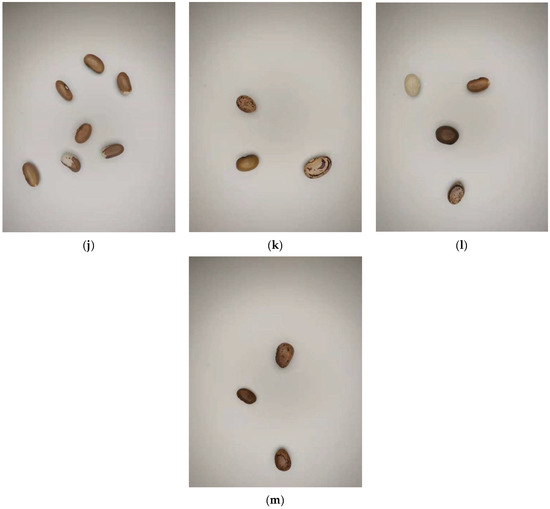The dataset of single-class and multi-class seeds: (a) bayuelv; (b) cuiguan; (c) dazihua; (d) fengguan; (e) hongguan; (f) jinguan; (g) juguan; (h) qingguan; (i) taikongdou; (j) yuguan; (k) combination of juguan, cuiguan, and hongguan seeds; (l) combination of taikongdou, qingguan, and fengguan; and (m) combination of bayuelv, yuguan, dazihua, and jinguan.