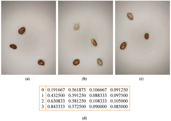 Different kinds of kidney bean seeds were labeled using the labeling tool LabelImg; the weights were obtained by training and testing according to the test set. The images of this dataset were processed into a JPG format, and the seeds of each species were labeled with the image processing tool LabelImg. Then, TXT files were generated by the LabelImg software to output the seed ID and coordinate location information, as presented in Figure 3. In Figure 3d, each row represents a seed that was labeled, and the labeled box was generated. From 0 to 3, the four categories of seeds were represented. The other four data in each row represent the center coordinates of the labeled box relative to the image, and the width and height of the labeled box relative to the image.