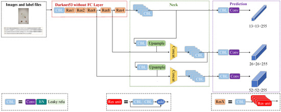 The network structure of Yolov3 is presented in Figure 4. The Yolov3 model is an improvement of the Yolov2 model, which mainly includes the optimization of the network structure. The Darknet19 network is improved in the Darknet53 network as the backbone network of the feature extractor, and multi-scale features are used for object detection [33]. The 52 convolutional layers were used to extract the features of the images in the network framework. To prevent the degradation of the model during the training of the deep network, Yolov3 created a link between the layers, which is borrowed from ResNet. The last layer is fully connected. Yolov3 could achieve localization and classification of targets in the images. The Darknet-53 network downsamples the image five times and also works with a residual net. This method allows the network to continue to rapidly converge in the deeper layers. Then, the features are extracted from the input image through a Yolo layer to obtain a feature map with a resolution of 13 × 13. The output feature map is upsampled by DBL operation on the 13 × 13 feature map, to obtain a 26 × 26 feature map. This is the same resolution as the feature map obtained by the five-times-downsampling strategy, and the results are summarized. Finally, the 26 × 26 feature map is upsampled and added to the feature map of the penultimate downsampling phase to obtain a 52 × 52 feature map [34]. In this way, the multi-scale prediction is achieved. The targets with different sizes can be predicted based on the different resolution feature maps. As presented in Figure 4, the Yolov3 network structure consists of three basic components: the CBL, Res unit, and ResX.