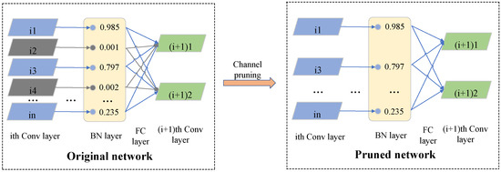 After the sparsity training, many scaling factors of the model were close to zero. Then, the sparsity scaling factor γ is ranked from smallest to largest. The closer the scaling factor is to zero, the less important the channel. Pruning the unimportant channels could simplify the model and reduce the model volume. The channel pruning process is presented in Figure 6. Therefore, the channels with scale factors close to zero, and the corresponding weights are pruned [39]. After sorting the scaling factors, ranging from small to large, the pruning rate needs to be set. The higher the pruning rate, the smaller the model size.