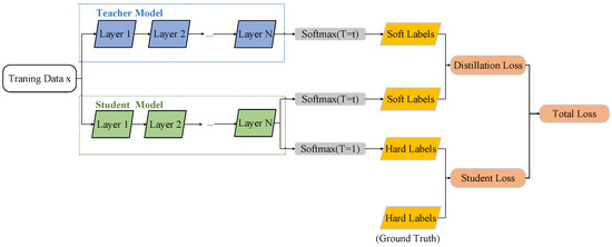 The flow of knowledge distillation is presented in Figure 7. The loss function is used to express the degree of difference between the prediction and actual data. It can measure how well the model performs predictions. It is obtained during the process of model training. Knowledge distillation is essentially also the process of training a model. Therefore, the loss of knowledge distillation needs to be calculated. Similarly, Figure 7 also illustrates the process of calculating the loss function for knowledge distillation. The loss function of knowledge distillation consists of two parts and the formula is as follows: