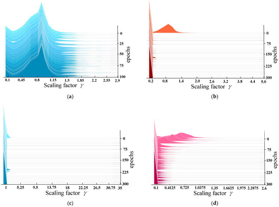 Figure 9 presented the changes in the scale factor prior to and after sparsity training. Additionally, the model obtained by choosing different sparsity factors, s, for sparsity training is presented in Figure 9. It can be observed that scaling factor γ of the sparsely trained model tends to be close to 0. Scaling factor γ close to 0 corresponds to channels with lower-weight. The importance of the less weight channels is low, so they should be pruned. At sparsity factors of 0.01 and 0.001 and training 300 epochs, the value of the scaling factor is close to 0. Therefore, there were fewer weight channels in the network.