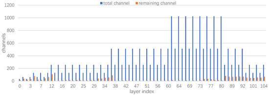 Figure 11 presents the change in channels following pruning; it can be observed that the channels are significantly reduced, especially channels 38 to 73. It can also be observed that some layer indexes of the network were lost, which indicates that the shortcut layers of the network were also successfully pruned. The Yolo pruning algorithm can significantly reduce the computational effort of the network model. Therefore, the method was feasible.