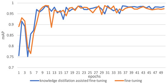 The mAP of knowledge-distillation-assisted fine-tuning and fine-tuning are presented in Figure 12. The loss functions of knowledge-distillation-assisted fine-tuning and fine-tuning are presented in Figure 13.