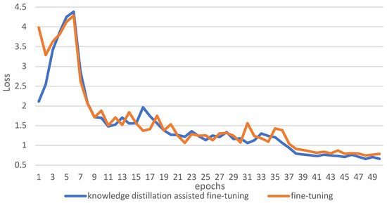 The comparison of the loss of fine-tuning and knowledge-distillation-assisted fine-tuning.