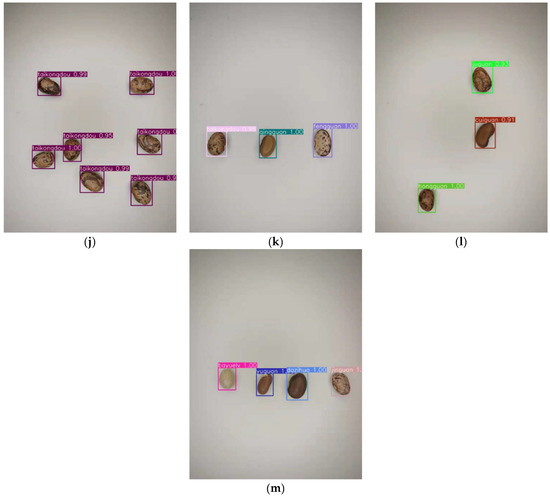 (a–j) The detection results for ‘juguan’, ‘fengguan’, ‘jinguan’, ‘bayuelv’, ‘yuguan’, ‘cuiguan’, ‘qingguan’, ‘dazihua’, ‘hongguan’, and ‘taikongdou’. (k–m) The detection results for random combinations of different classes of seeds.