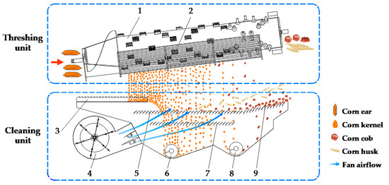 Corn is an important food crop and feed source, and the most productive crop worldwide [1]. With the increase in the corn plant area, the percentage of corn combine harvesters is rapidly increasing. The corn combine harvester can complete the processes of ear snapping, threshing, cleaning, and collection simultaneously, which has a high efficiency [2]. However, it also suffers from high loss and high impurity rates [3,4]. In the corn combine harvester, a longitudinal axial threshing drum and an air-and-screen cleaning device are wildly used for threshing and cleaning [5]. In recent years, several studies have committed to researching the threshing and cleaning device to reduce impurity and loss. Petkevichius et al. [6] analyzed the effects of drum speed and concave clearance on grain separation. Results showed that increasing the clearance appropriately had a significant effect on reducing grain loss and crushing. Wang et al. [7] proposed a corn threshing drum with a gradual change in diameter. The drum enhanced the contact and rubbing between the ears to achieve rapid separation of the kernel from the cob. Geng et al. [8] developed a plate tooth threshing device based on the mechanical characteristics of non-equilibrium threshing. It effectively reduced the grain damage to meet the requirements of corn combine harvest with high moisture content. Badretdinov et al. [9] simulated and analyzed the cleaning process of the grain combine harvester. The parameter combination of the cleaning device was determined through a mathematical model of the material and airflow. Gebrehiwot et al. [10] studied the influence of crossflow openings on the performance of centrifugal fans. Wang et al. [11] explored the material properties, structural forms, and working parameters of the corn cleaning screen. Based on these studies, several cleaning screens, such as a curved screen, combined hole screen, and polyurethane rubber screen, were designed. Liang et al. [12] developed a multi-duct cleaning device with a return pan for rice combine harvesters according to the distribution of airflow and threshed outputs.