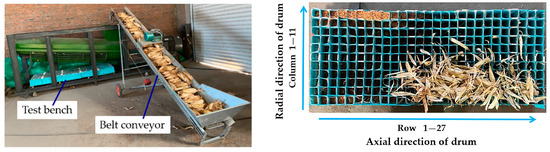 The longitudinal axial threshing drum for corn was used for the distribution experiment, as shown in Figure 2. The threshing test bench mainly consisted of a frame, power unit, feeding inlet, top cover, concave, threshing drum, and collection boxes. Corn ears were fed into the feeding inlet by a conveyor and then were threshed and separated. The corn threshed mixture passed through the concave and dropped into the collection boxes. In each trial, corn ears were placed in order and fed with a constant velocity into the feeding inlet by a belt conveyor (Figure 3). After being threshed, the threshed mixture was collected by the collection boxes (Figure 4). The drum speed was adjusted by an FR500-4T-110G frequency converter (Frecon Electric Co., Ltd., Shenzhen, China). The concave clearance was adjusted with the bolt falling depth. The feed rate was adjusted by changing the conveying speed according to the different requirements.
