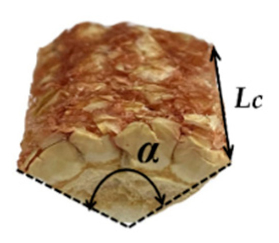 In the corn threshed mixture, the shapes of the corn cobs were mainly incompletely cylindrical and a few completely cylindrical [28]. In Figure 6, the length (Lc) and angle (α) were selected as characteristic sizes to count the particle size [29]. The effect of drum speed on the particle size distribution was analyzed (Figure 7).