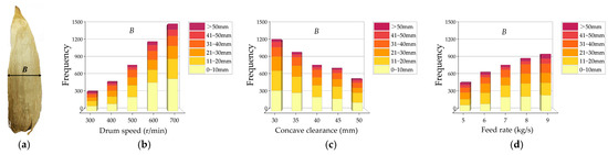 The particle size distribution of corn cobs with a change in feed rate is shown in Figure 7e,f. In general, the number of corn cobs increased with the feed rate. However, analysis of variance showed no significant difference under different feed rates. When the feed rate was slow (5 kg/s), there were more collisions, leading to more broken corn cobs. Nevertheless, when the feed rate increased, corn ears were threshed insufficiently, resulting in a decrease in the number of broken cobs. Likewise, as shown in Figure 8b, we also noticed that the broken angle was increasing with the feed rate. Thus, the increased number of corn cobs—due to increased feed rate—was partially offset by the decrease due to breaking. The number and proportion of “small length” cobs showed a downward trend, while the “medium length” and “large length” showed a clear rising tendency. Combined with the weight distribution analysis, the weights of “medium length” and “large length” were dominant, which also helps explain why the total weight was still increasing.