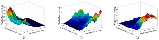 Three-dimensional distribution of the weight. (a) Weight distribution pattern of corn kernels. (b) Weight distribution pattern of corn cobs. (c) Weight distribution pattern of corn husks.