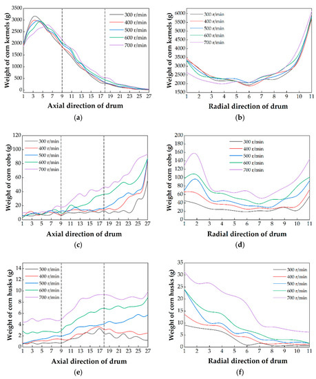 In Figure 10e, the weight of corn husks increased continuously in the axial direction. Indeed, most husks were peeled off the ears in the first nine rows. However, the corn husks were broad and unable to get through the concave at this stage. In rows 10–27, they were crushed under impact and fell constantly. Therefore, the weight showed a sharp upward trend. The total weight of corn husks increased greatly with the increase in drum speed. This was due to the increase in the frequency of collisions between the drum and husks. Along the radial direction (Figure 10f), corn husks mainly gathered in the left 1–6 columns. The reason was that some husks did not pass through the top cover to the right side due to excessive volumes. As the drum speed increased, the husk weight in columns 1–6 increased. The more serious accumulation is on the left side. Especially, the weight of the husks increased rapidly when the drum speed was 700 r/min. Thus, it added to the difficulty to reduce the impurities rate in the cleaning process.