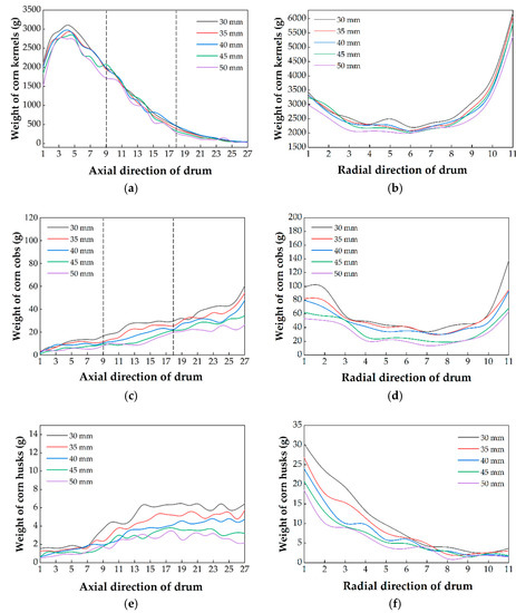 Figure 11a shows that the weight of corn kernels decreased and then increased. The basic tendency was the same under five concave clearances. Since the threshing space became larger when the concave clearance increased, the collision frequency of the drum to corn ears decreased. The weight in each column was constantly declining. The total mass decreased by 896 g while the concave clearance increased from 30 to 50 mm. Some kernels on the ear were transported without being threshed, which caused a large kernel loss. Because of the same reason, the weight in each column was constantly declining, which can be seen in Figure 11b. In the radial direction, as shown in Figure 11b, with a small concave clearance, more ears were moved on the right side under the rubbing action. As the concave clearance increased, the loose flow of ears in the threshing space made it easier for kernels to fall through the concave. Hence, the radial distribution of the mixture tended to be uniform.