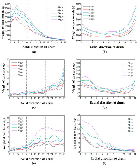 As shown in Figure 12c, the weight of corn cobs was increased continuously in the axial direction. It is found that the corn cob weight increased with the increase in feed rate, including the weight of each row and the total weight. When the feed rate increased from 5 kg/s to 9 kg/s, the weight raised from 319 g to 724 g. In the radial direction, the distribution trend decreased first and then increased (in Figure 12d). With the increase in feed rate, the weight in each row increased gradually, and the accumulation on both sides was more serious. More corn cobs gathered to both sides under the rubbing action due to the density increase.