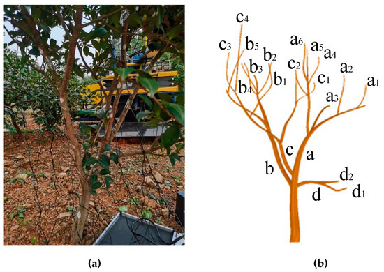 Camellia oleifera tree. (a) real photo; (b) 3D modeling. a, b, c, d represent different first-level branches of Camellia oleifera and ai, bi, ci, di represent different second-level branches of Camellia oleifera.