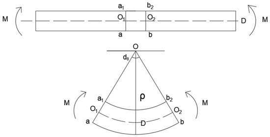 A micro segment is removed from the curved deformed branch, as shown in Figure 3, in which O1O2 is the neutral axis, and the length is dx. According to the basic assumptions of elasticity, the neutral axis length remains unchanged before and after the deformation of the micro segment, and the ab length at the bottom will change, and the amount of change is shown in (4):