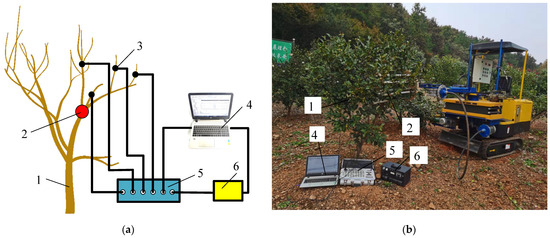 (a) Schematic diagram of data acquisition; (b) Test diagram of data acquisition. 1. Camellia oleifera tree; 2. Excitation position; 3. Acceleration sensor and strain gauge; 4. Computer; 5. Signal acquisition instrument; 6. Portable power source.