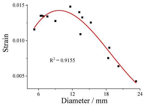 Relationship between Camellia oleifera branch diameter and ultimate strain value. R2 is the polynomial fitting correlation coefficient.