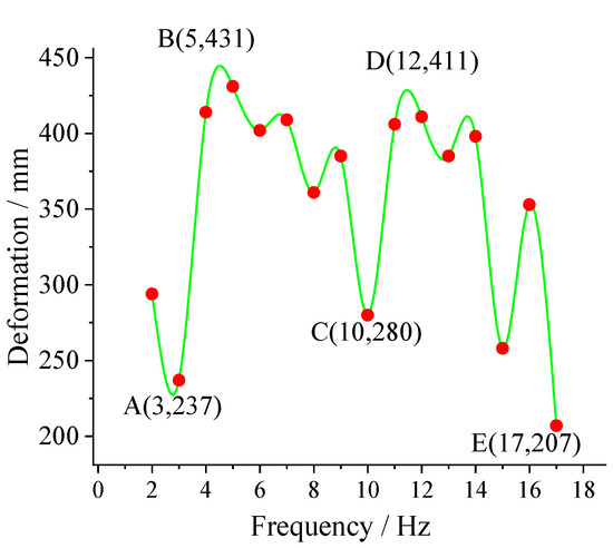 Line chart of frequency and deformation response of Camellia oleifera. A, B, C, D and E represent the excitation frequencies with typical displacement characteristics.
